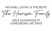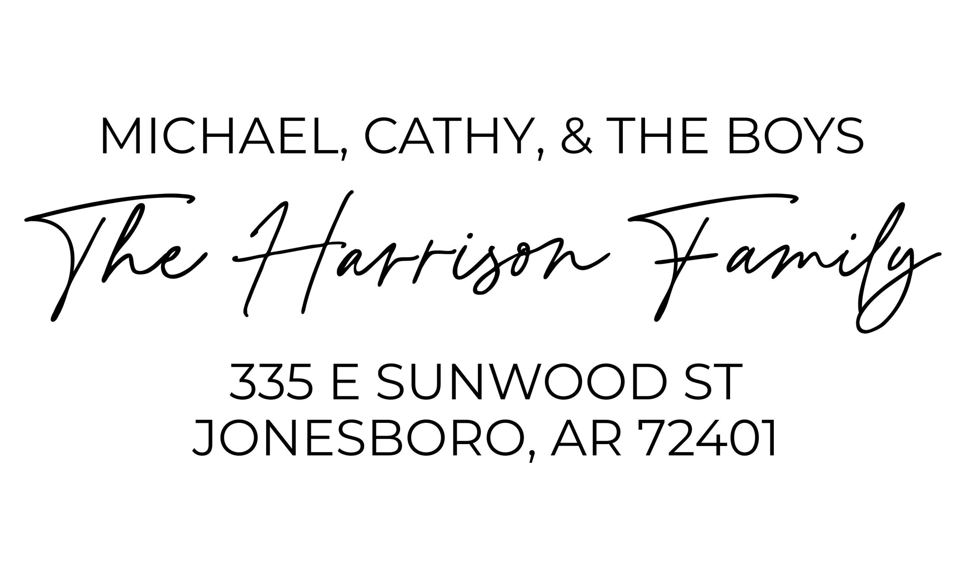 Make your mail stand out with The Harrison Family Address Stamp! Featuring a unique, stylized design with your family's names in modern and script lettering. This high-quality stamp will add a personal touch and plenty of personality to every package and letter you send.