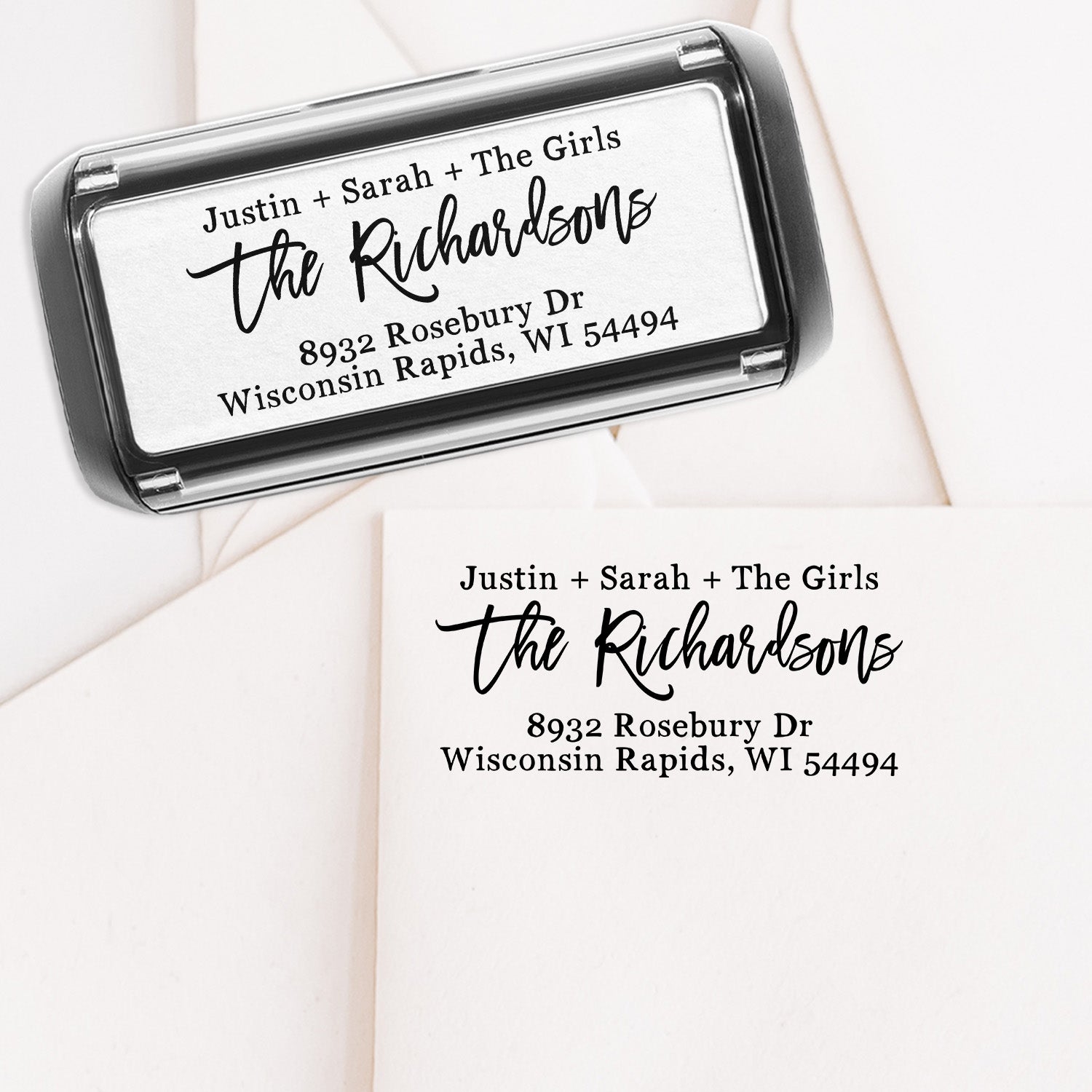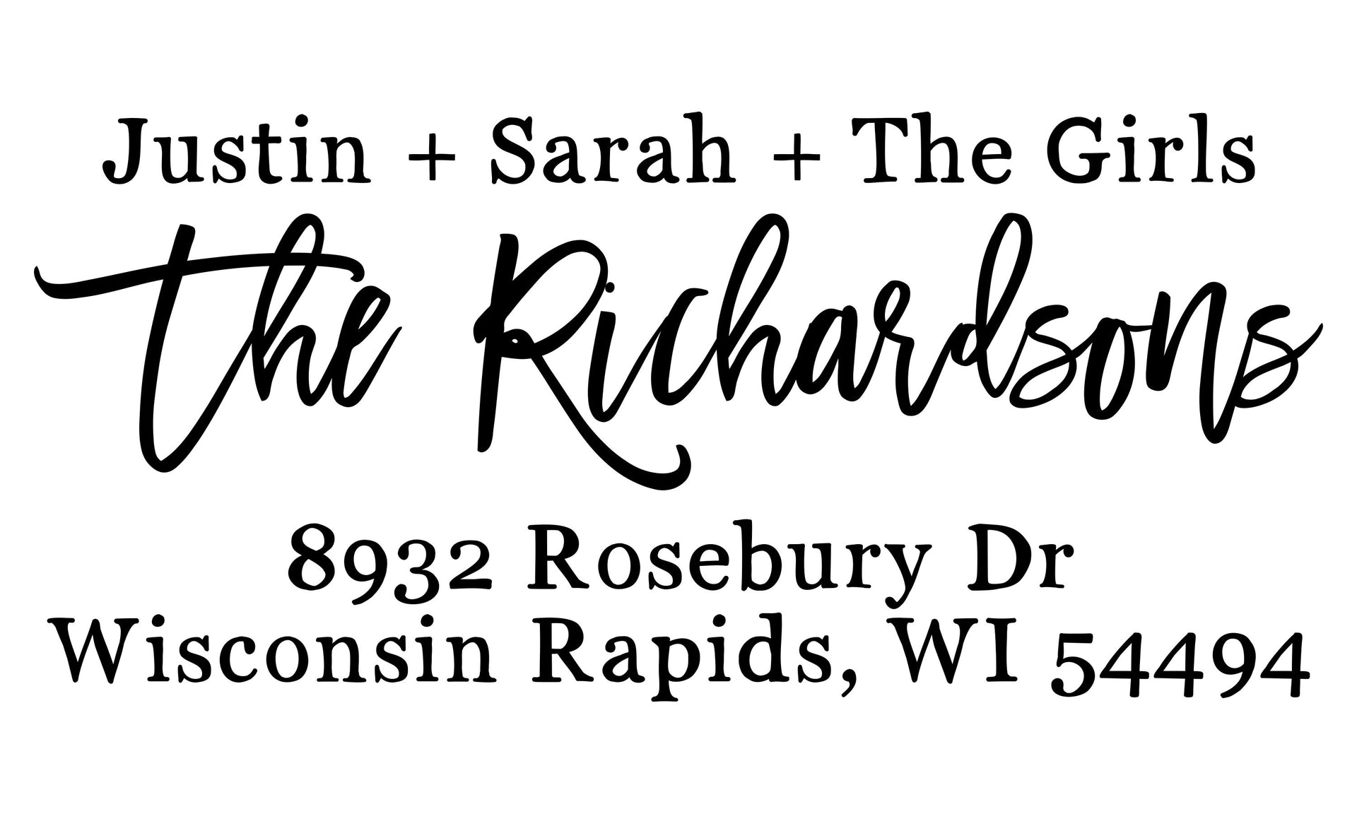 Make your mail stand out with The Richardsons Family Address Stamp! Featuring a unique, stylized design with your family's names in modern and script lettering. This high-quality stamp will add a personal touch and plenty of personality to every package and letter you send.