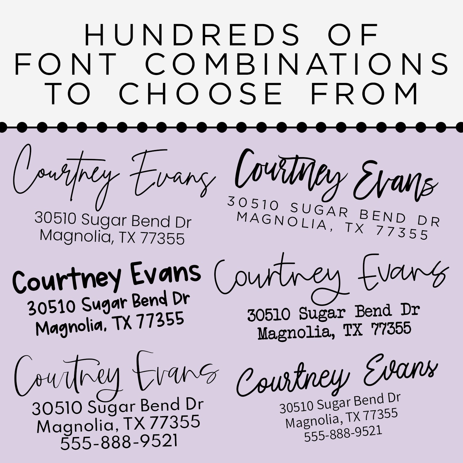 Make your stamp even more personalized! Choose from a variety of fonts for a fully custom-made stamp. This address stamp is perfect for adding your return address to envelopes, postcards, and letters.
