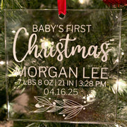 Celebrate your sweet newborn's first Christmas with our personalized acrylic ornament. Makes a great gift for new parents or grandparents! This ornament is personalized and made to order with your baby's name (first and middle), birth weight and length, time, and date. Design is laser engraved.