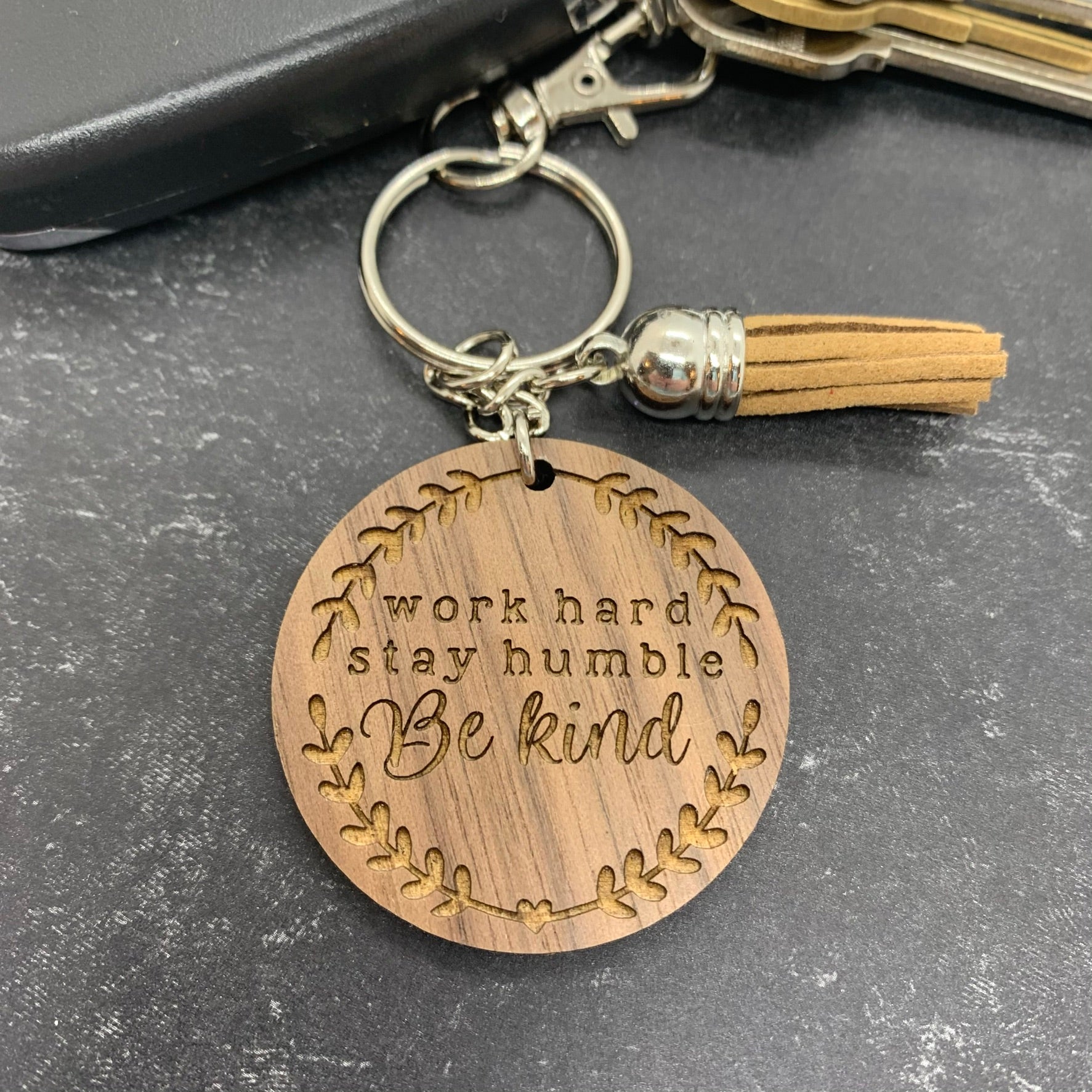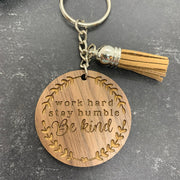 Add our Be Kind Keychain to your key ring or bag and keep this great reminder with you everywhere you go. The keychain reads "work hard, stay humble, be kind" with a simple wreath on the outside.