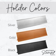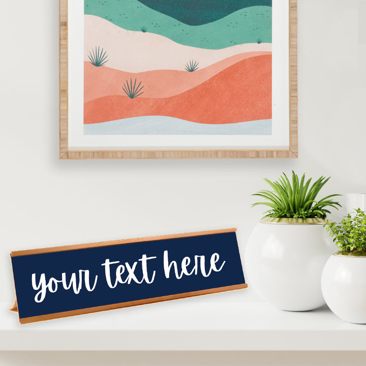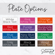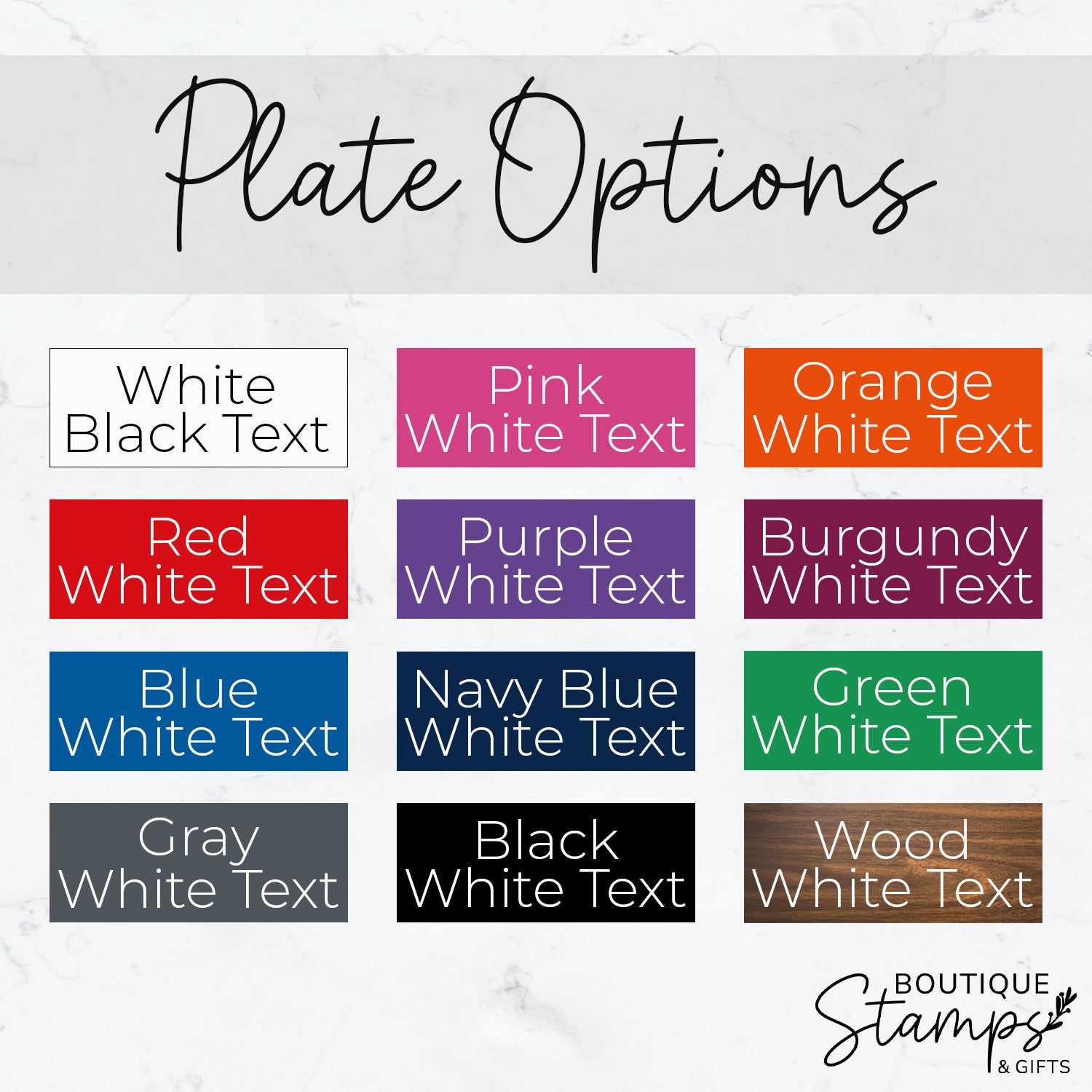 Enter your own phrase/text, choose your own font, and combine one of our 12 plate colors and 3 holder colors to create your own desk plate. Plate colors include white, pink, orange, red, purple, burgundy, blue, navy blue, green, gray, black, and wood. Holder colors include silver, gold, and black.