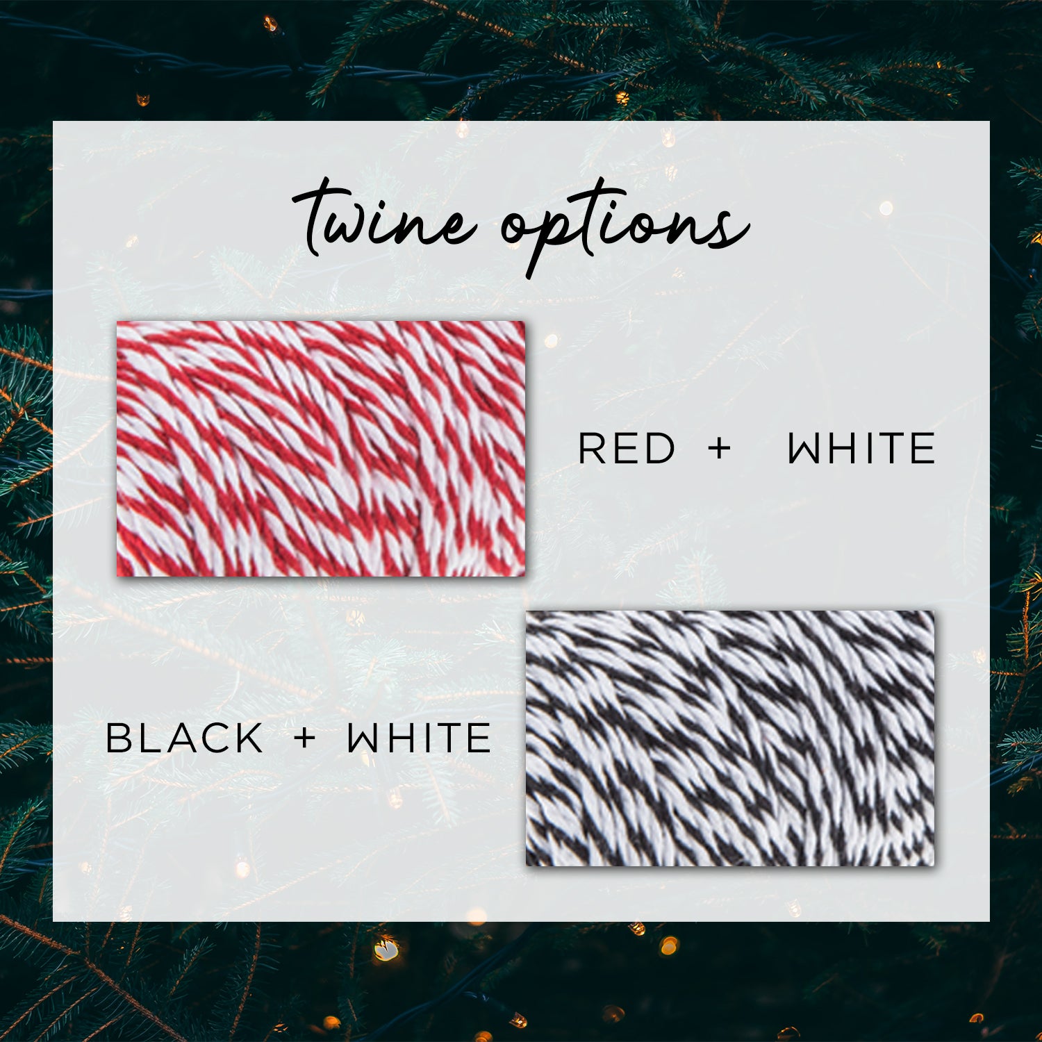 This ornament is 2.5" x 4.5" and 1/8" thick. Includes a hole at the top and twine for hanging. Twine color choices are red + white or black + white.