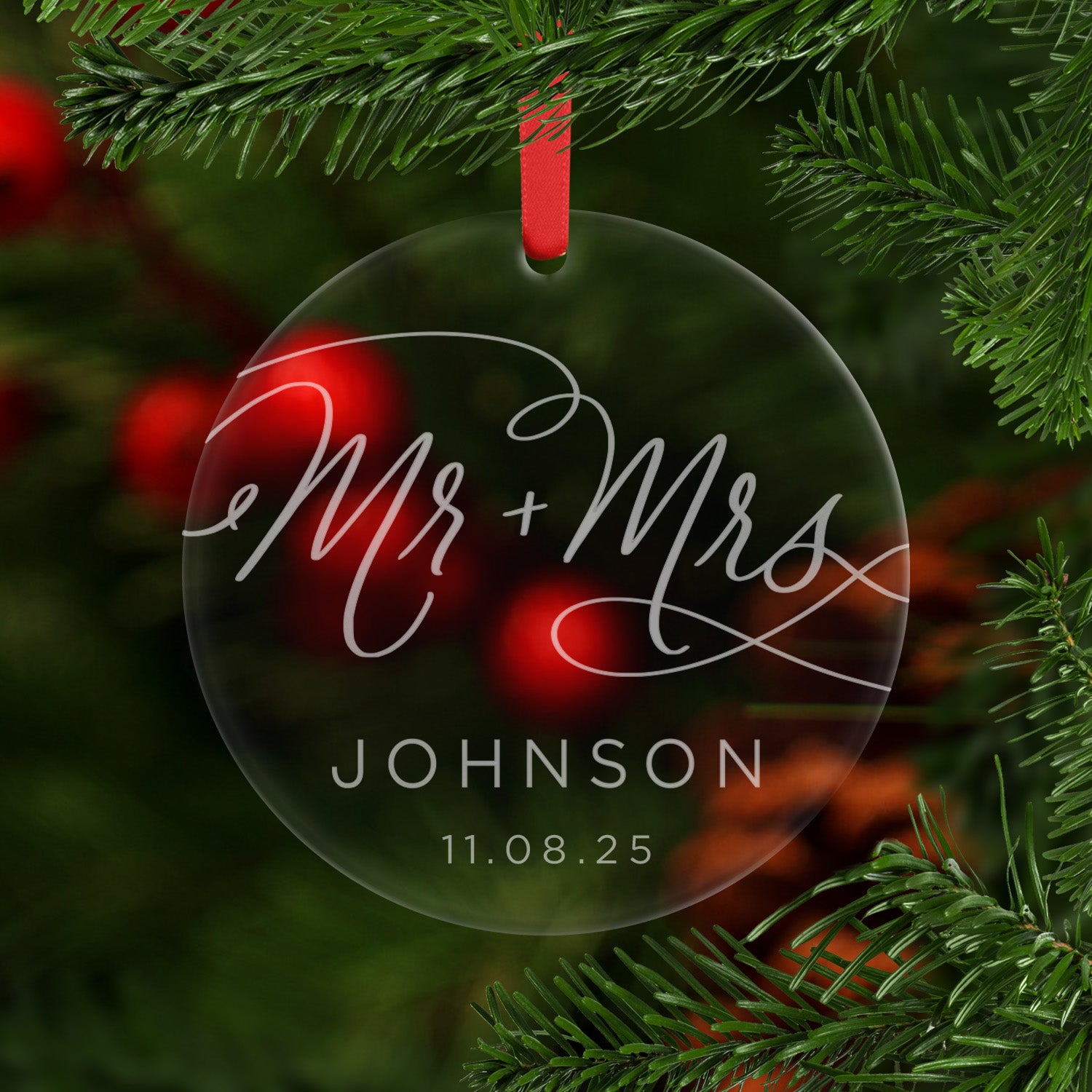 Our personalized acrylic ornament is perfect for newlyweds to hang on their Christmas tree for their first Christmas as Mr. & Mrs. This ornament is personalized and made to order with your last name and wedding date. Design is laser engraved.