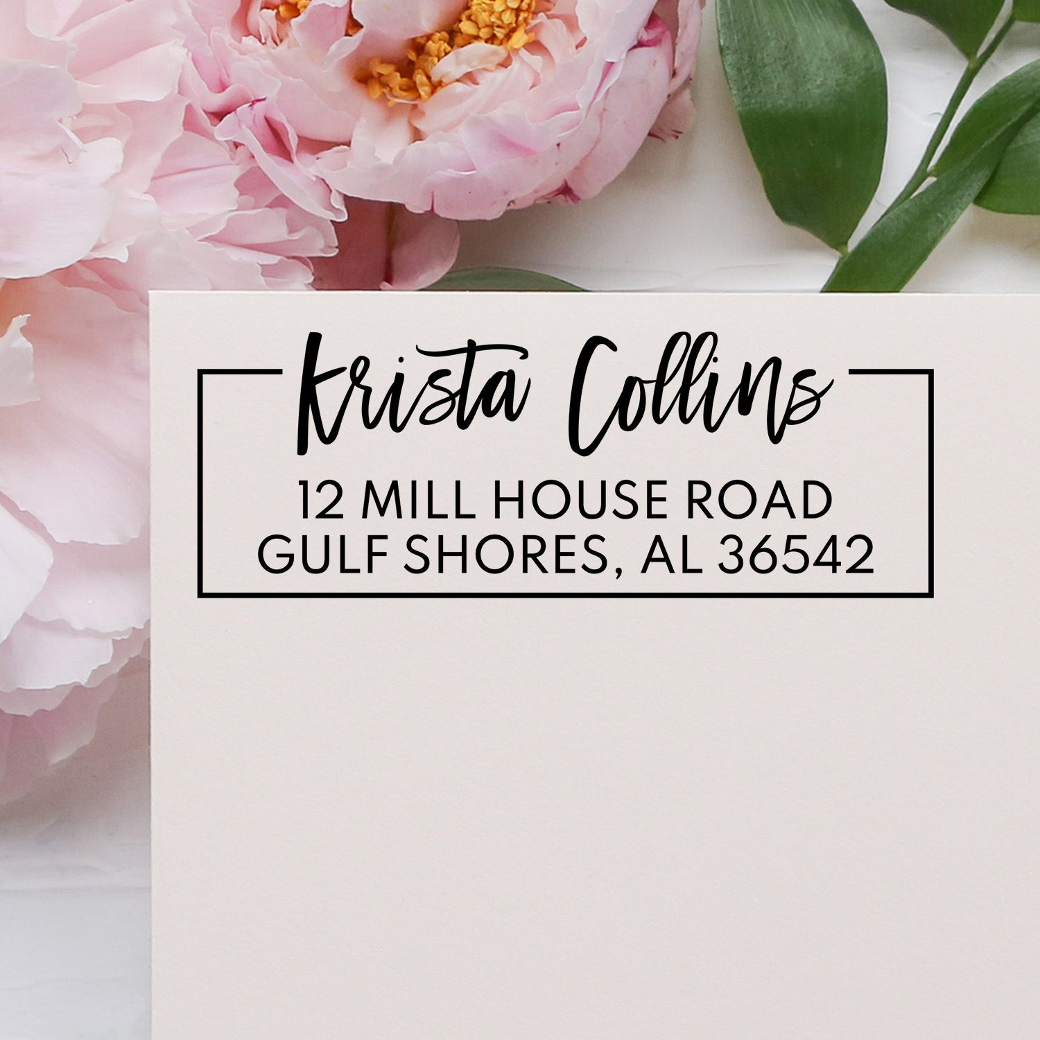 Easily add your return address with this uniquely designed stamp! Great for stamping on envelopes, postcards, and more.