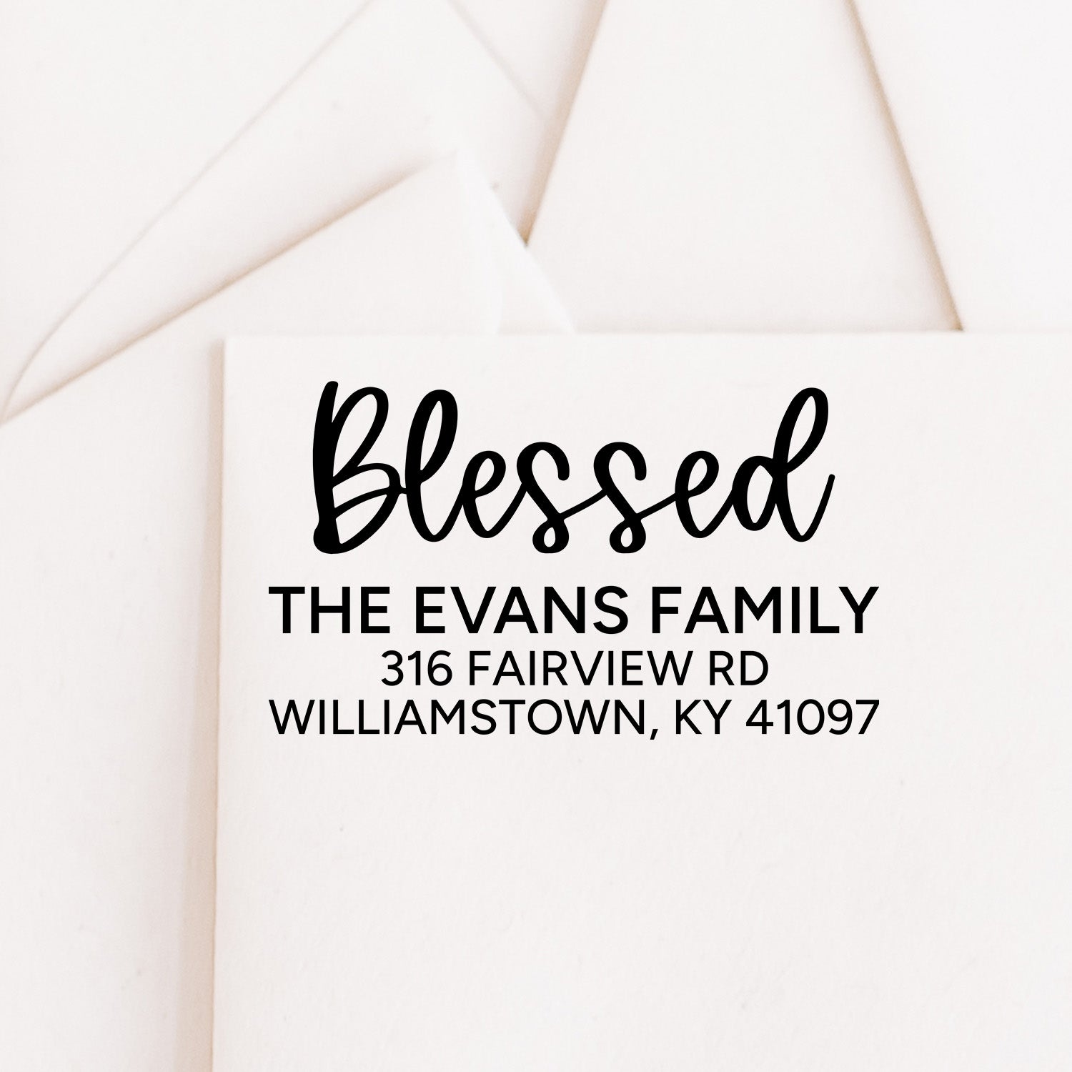 A beautiful, faith-inspired address stamp featuring a bold “Blessed” script paired with clean, modern lettering. Personalized with your family name and address, it adds a warm, meaningful touch to every envelope. Perfect for everyday mail, holiday cards, or gifting.