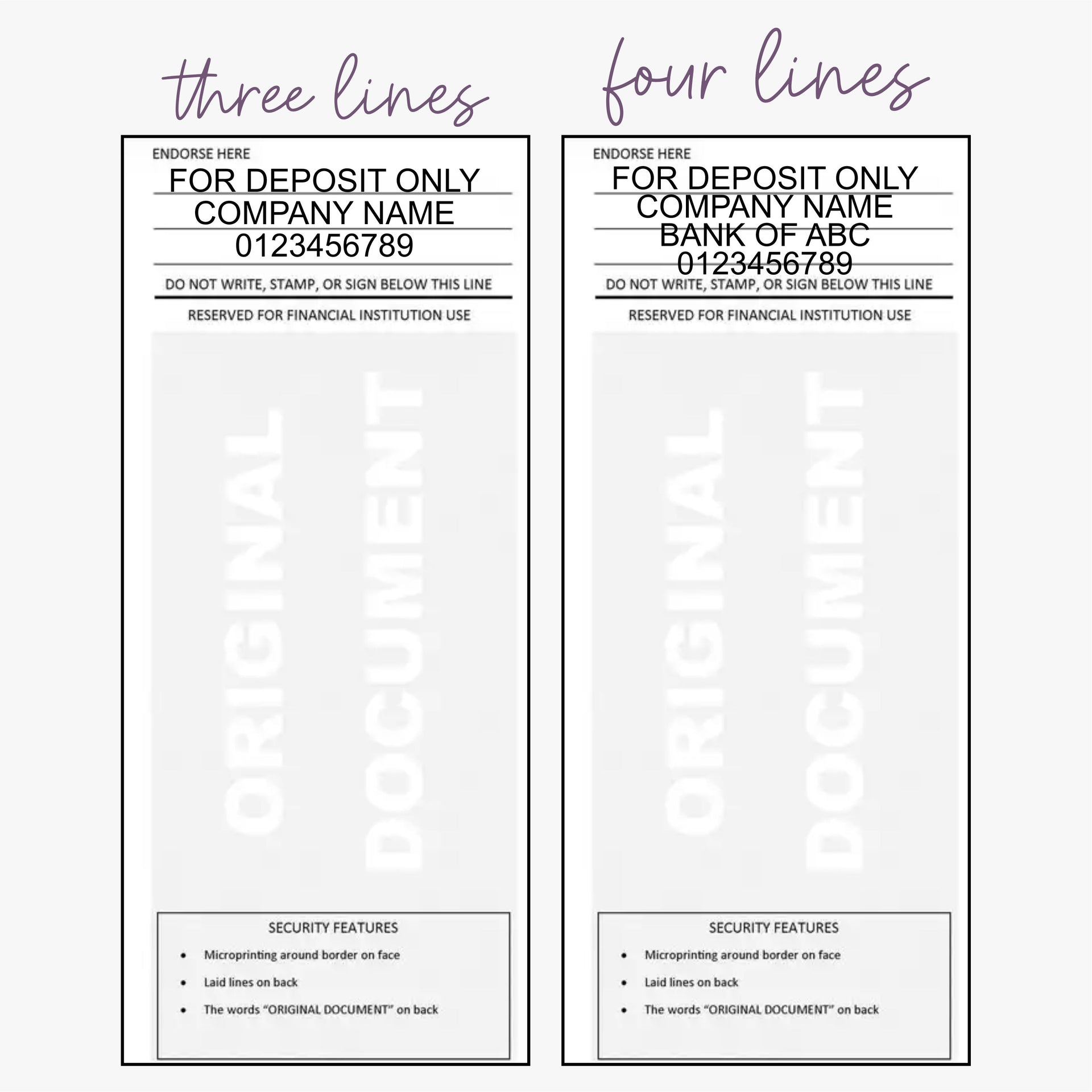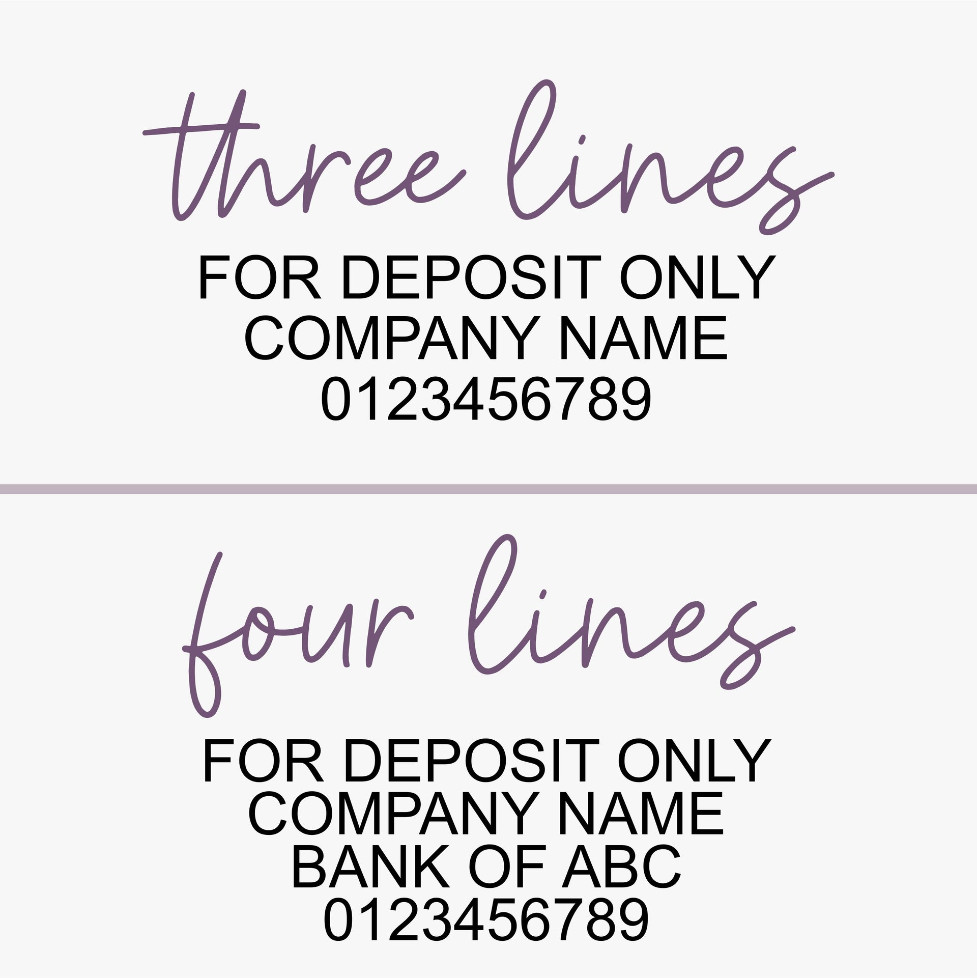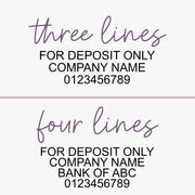 Ensure quick and easy processing of check deposits with our For Deposit Only Stamp. Marking your checks with this stamp will save you time and effort at the bank, allowing you to focus on your business. Choose from 3 or 4 lines of text to best fit your needs. Just stamp and deposit - it's that easy.