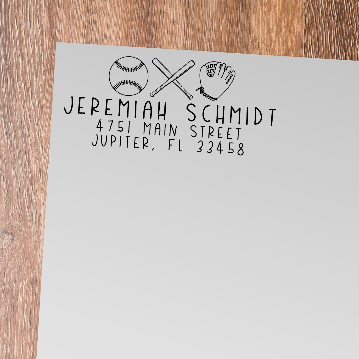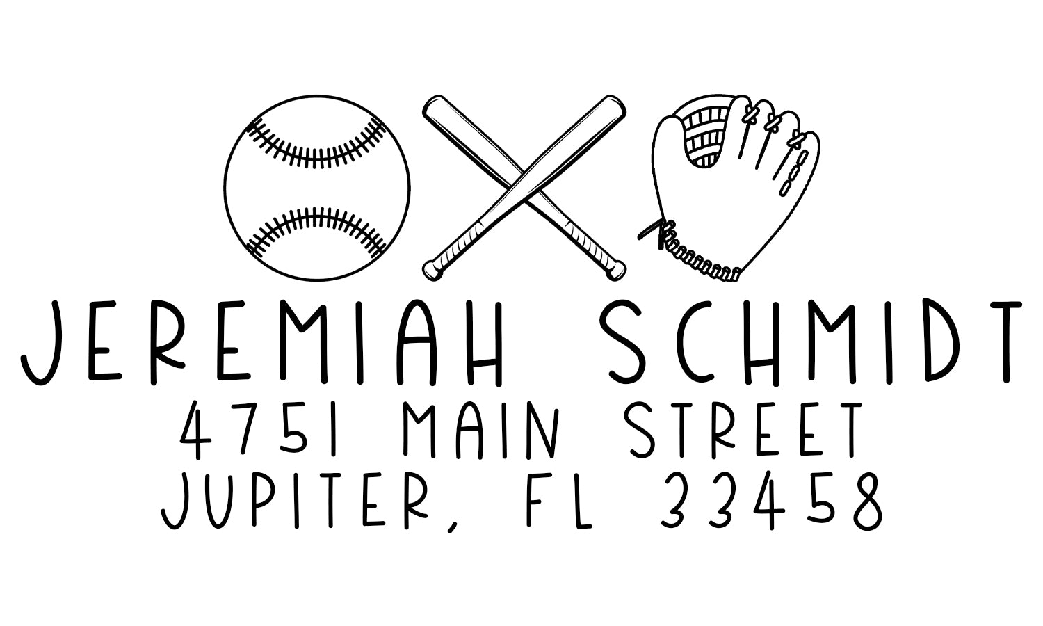Baseball fans love this address stamp! Easily add your return address with this uniquely designed stamp! Great for stamping on envelopes, postcards, and more.