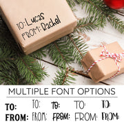 Easily add to and from to gift tags, wrapping paper, cards, envelopes, and more with this self-inking stamp! Choose from 6 different font styles. Your stamp comes filled with one premium ink color of your choice. Choose from black, red, blue, green, or violet.