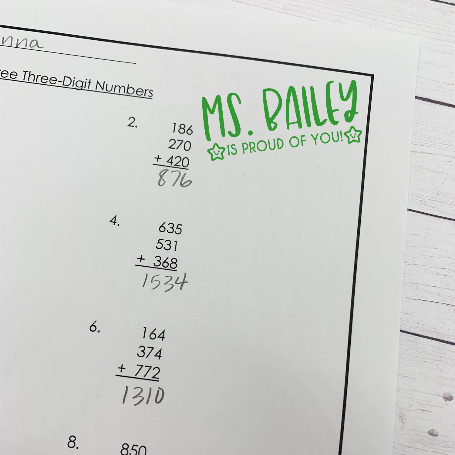 This stamp makes giving feedback simple! It is a great tool for teachers to use to communicate with students on daily assignments, homework, projects, etc. The self-inking stamp can be personalized with your favorite color. Choose from black, red, blue, green, or violet.