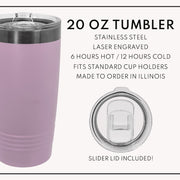This laser engraved 20 oz. stainless steel tumbler features double-wall vacuum insulation and a clear slider lid. The mug has a narrower bottom to fit most standard cup holders. It is 2x heat and cold resistant compared to a normal tumbler.