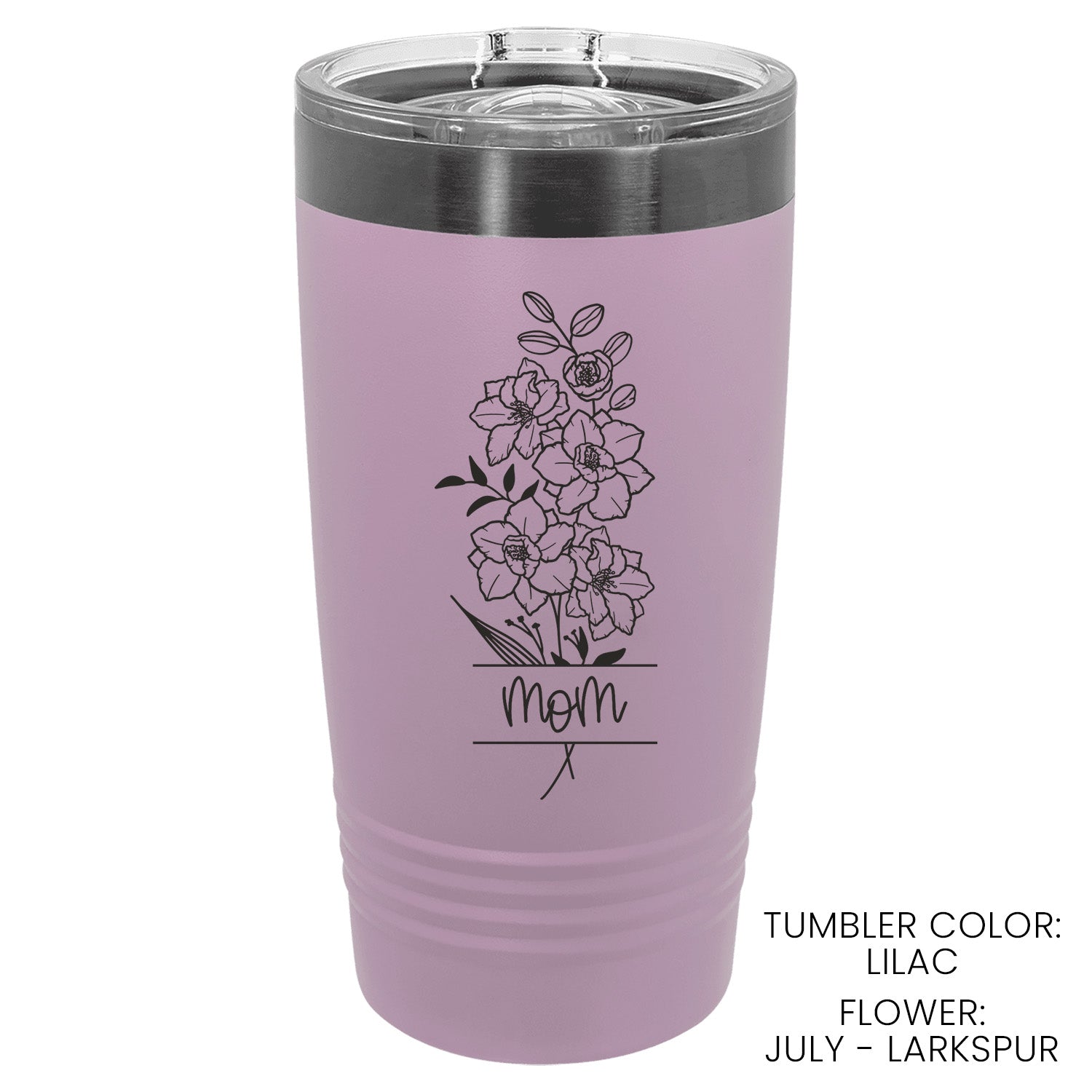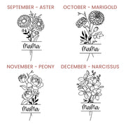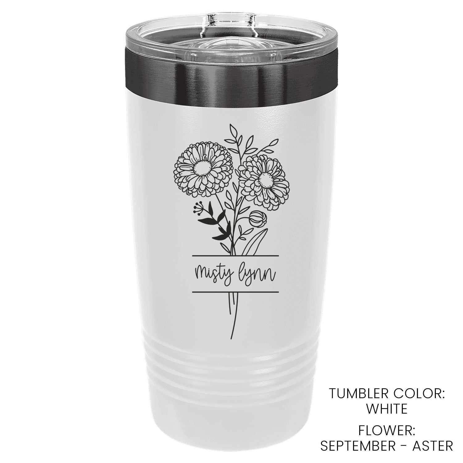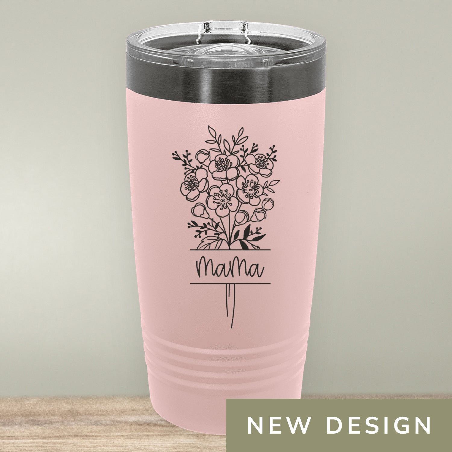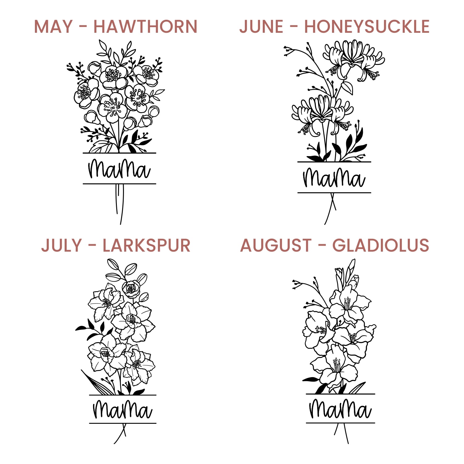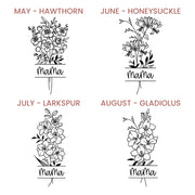 Personalize yours with a flower symbolizing a birth month and name of your choice. Four color options to choose from: blush, lilac, sage, or white. Engraving color is ghost black. Makes a great Mother's Day gift, bridesmaid proposal, or birthday present!