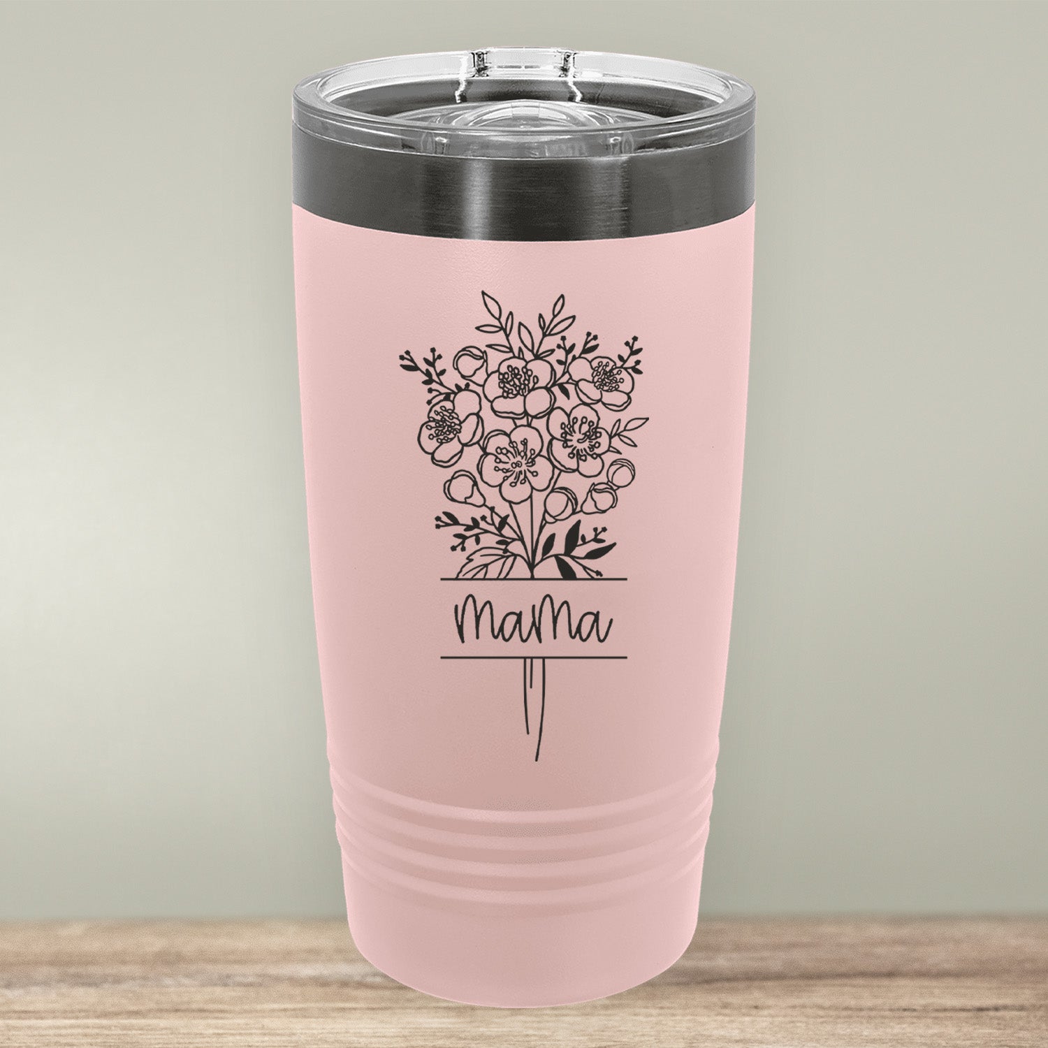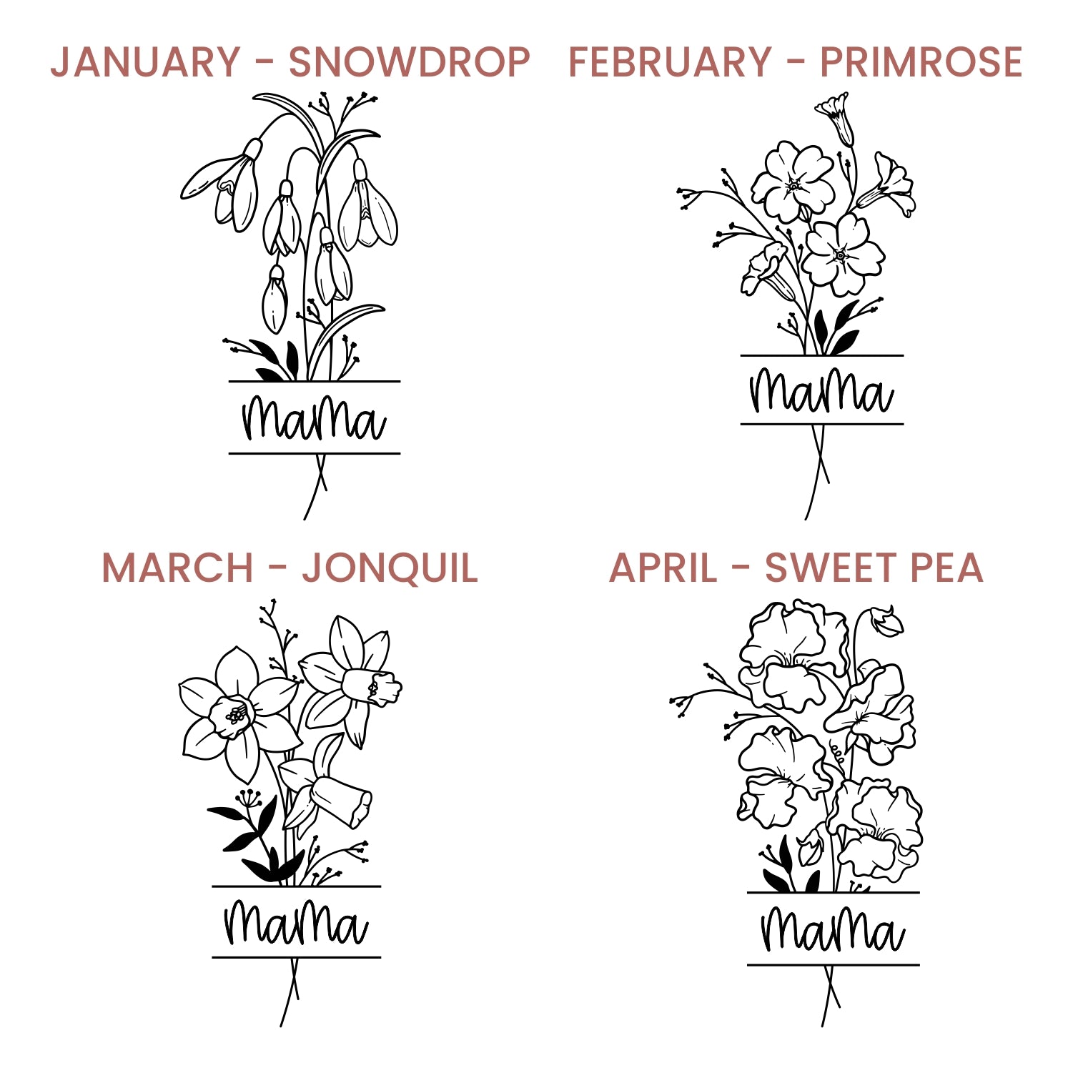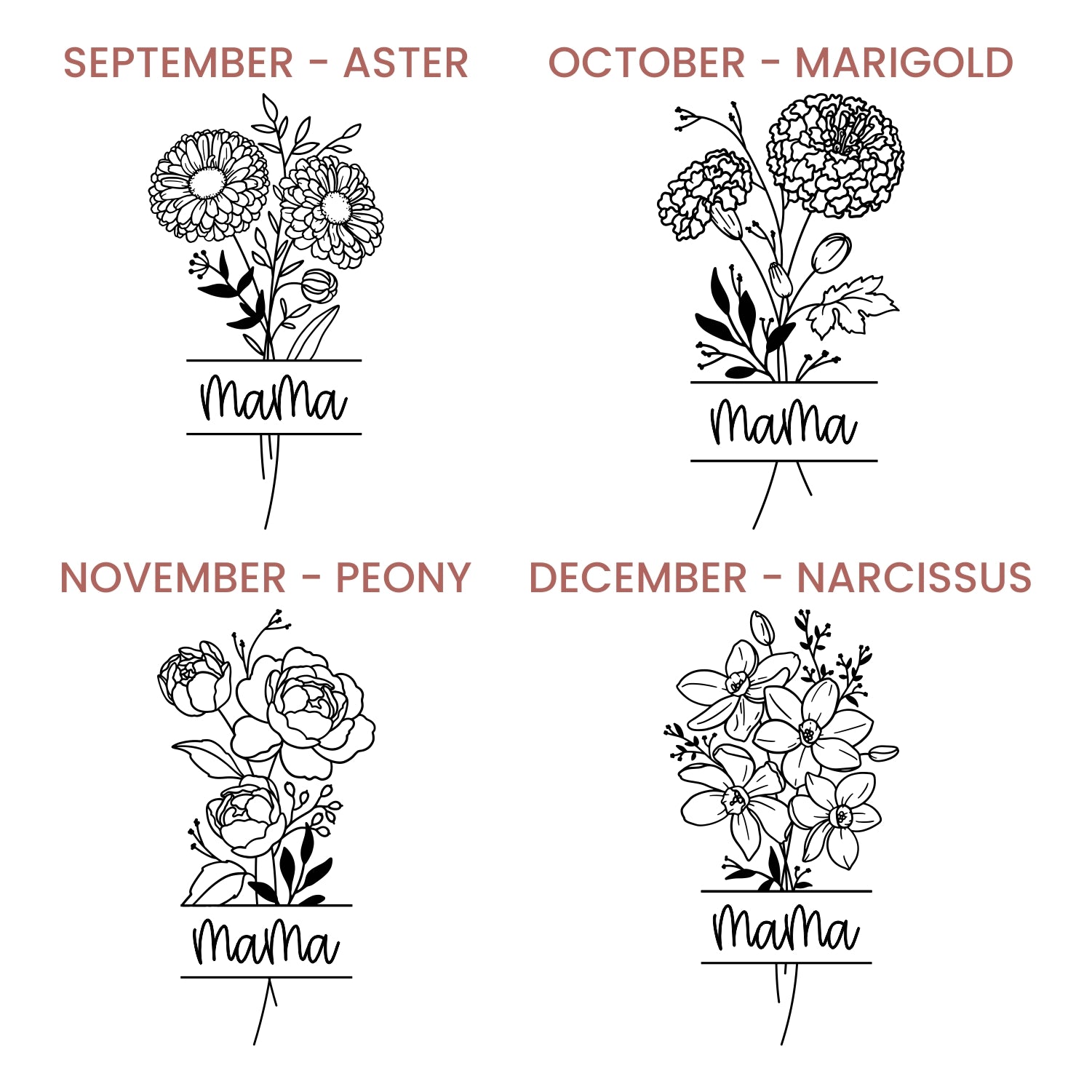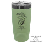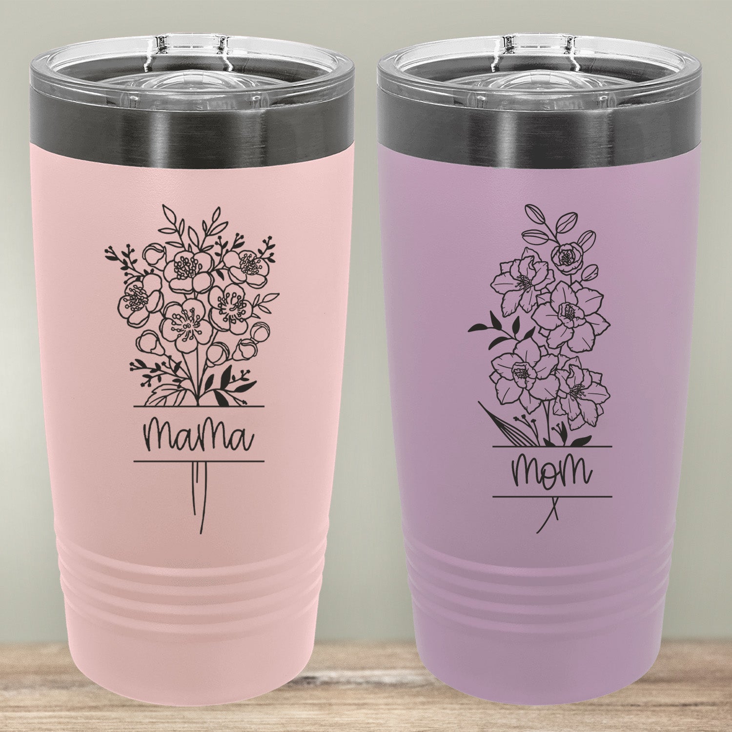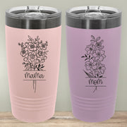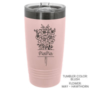 Personalize yours with a flower symbolizing a birth month and name of your choice. Four color options to choose from: blush, lilac, sage, or white. Engraving color is ghost black. Makes a great Mother's Day gift, bridesmaid proposal, or birthday present!