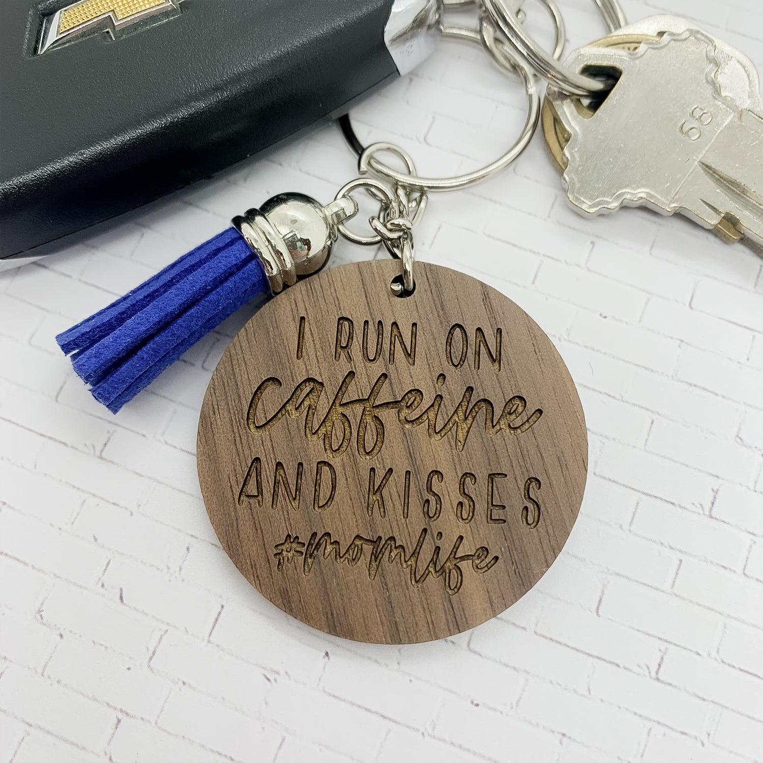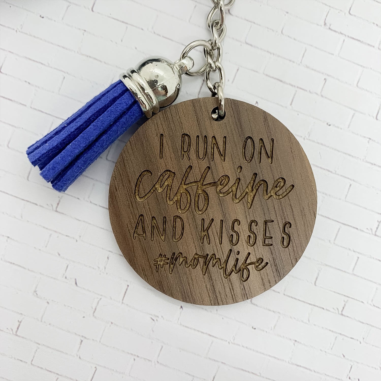Add our Caffeine and Kisses Keychain to your key ring or bag and keep this great reminder with you everywhere you go. The keychain reads "I run on caffeine and kisses #momlife."
